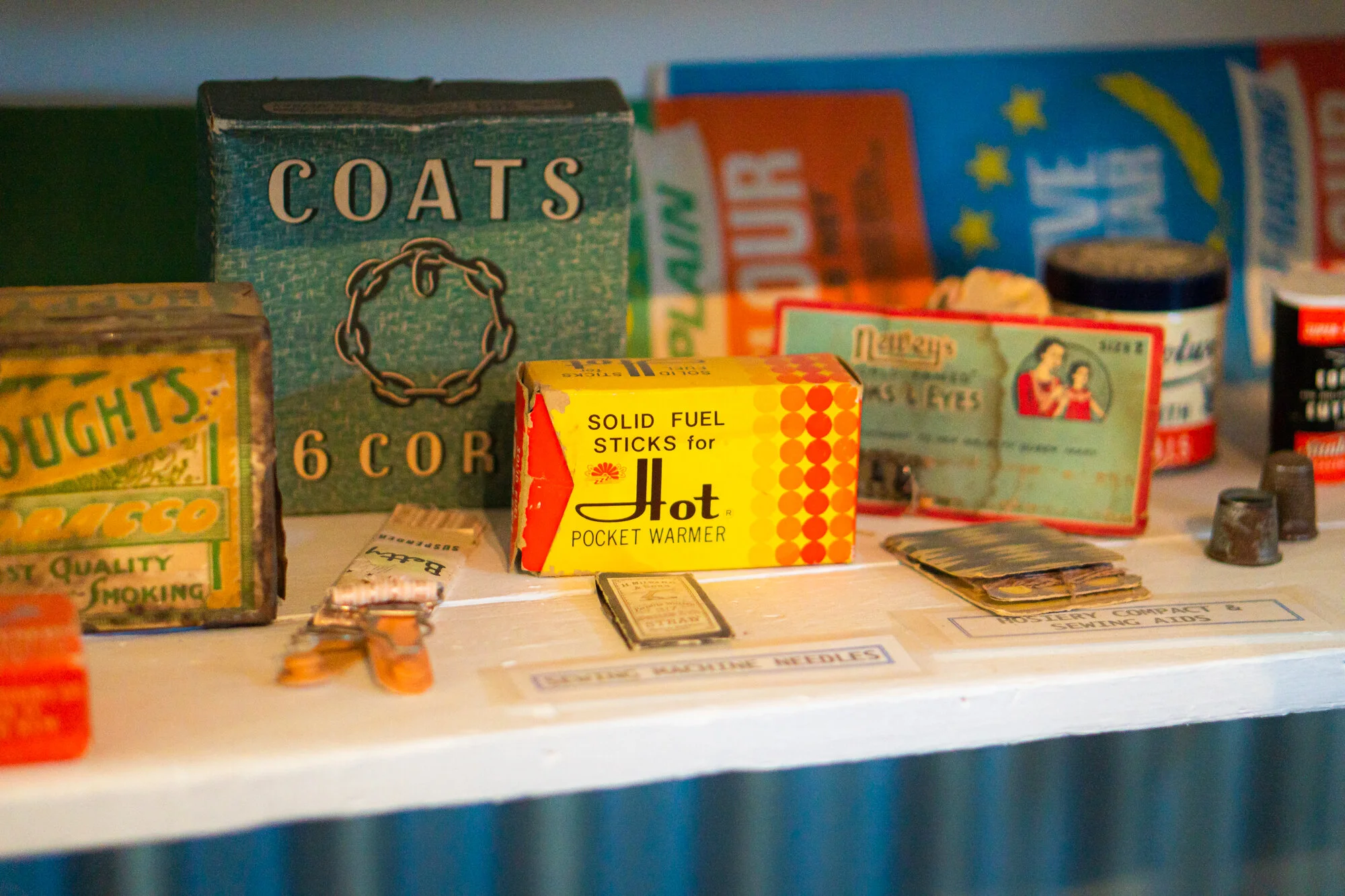 Full of vintage objects and products from an earlier time.